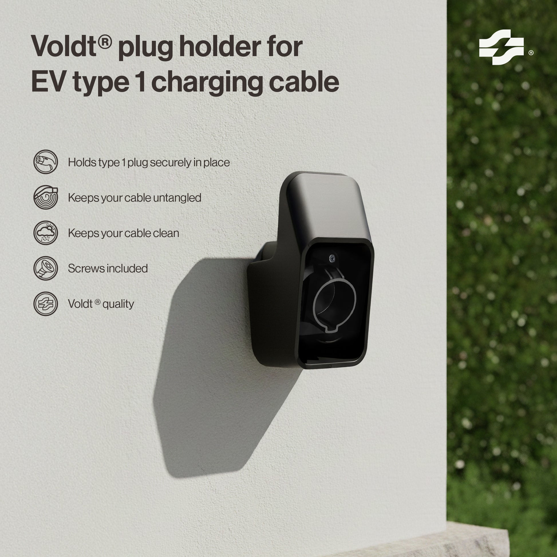 Der Voldt® Plug Holder für EV Typ 1 Ladekabel bietet eine sichere und ordentliche Aufbewahrungslösung für jeden Typ-1-Stecker. Gefertigt aus leichtem PVC, hält er den Stecker zuverlässig an seinem Platz, wenn er nicht verwendet wird. Der Halter verhindert, dass der Stecker auf dem Boden liegt, und schützt ihn vor unnötigem Verschleiß. Die benötigten Schrauben für eine stabile Wandmontage sind im Lieferumfang enthalten. Der Halter unterstützt einen sauberen Ladebereich für den Innen- und Außenbereich. Seine Form ist exakt auf die Konturen eines Typ-1-Steckers abgestimmt, sodass dieser ohne Kraftaufwand sicher einrastet. Dadurch wird die Kabelbelastung reduziert und die Lebensdauer der Ladeausrüstung verlängert. Die Montageplatte positioniert den Stecker in einem komfortablen Winkel für den täglichen Gebrauch.